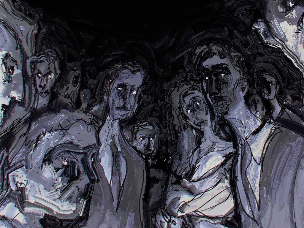 Someone collapses to the ground. I’m trying to discern who it might be. A curious crowd begins to gather—so many people, so many different faces. The air is filled with a stench reminiscent of a massacre—the reek of corpses assaults my nostrils. My stomach churns—I feel like I’m going to vomit.